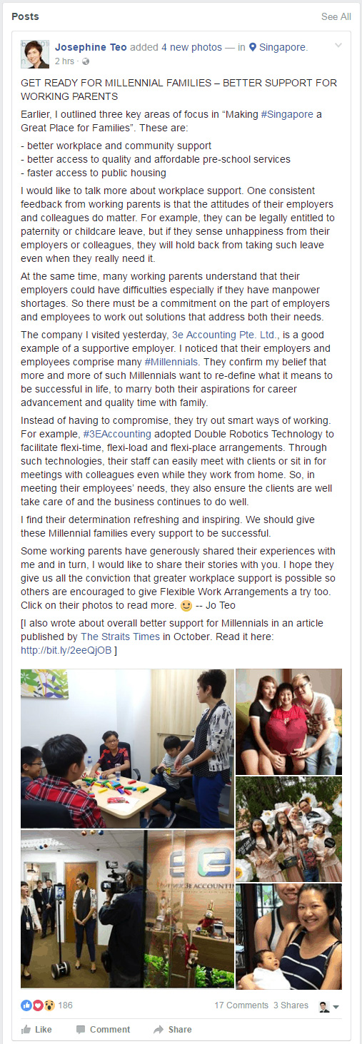 “These are very encouraging new ways in which millennial families are trying to marry their aspirations for career advancement as well as the desire for quality time with family.” Said Mrs Teo who encourages more SMEs to start create such work environment for millennial families together in today’s society.